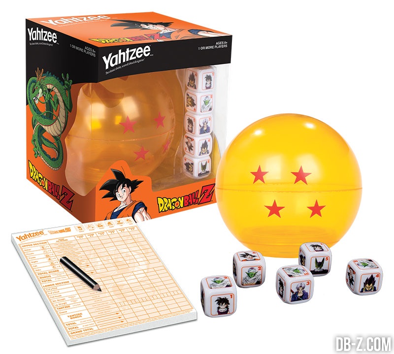 Dans le même genre, sachez également qu’un Yahtzee Dragon Ball Z officiel débarquera aussi très bientôt, avec 5 dés personnalisés Dragon Ball, une coupe personnalisée Dragon Ball, un calepin personnalisé Dragon Ball et… le crayon.