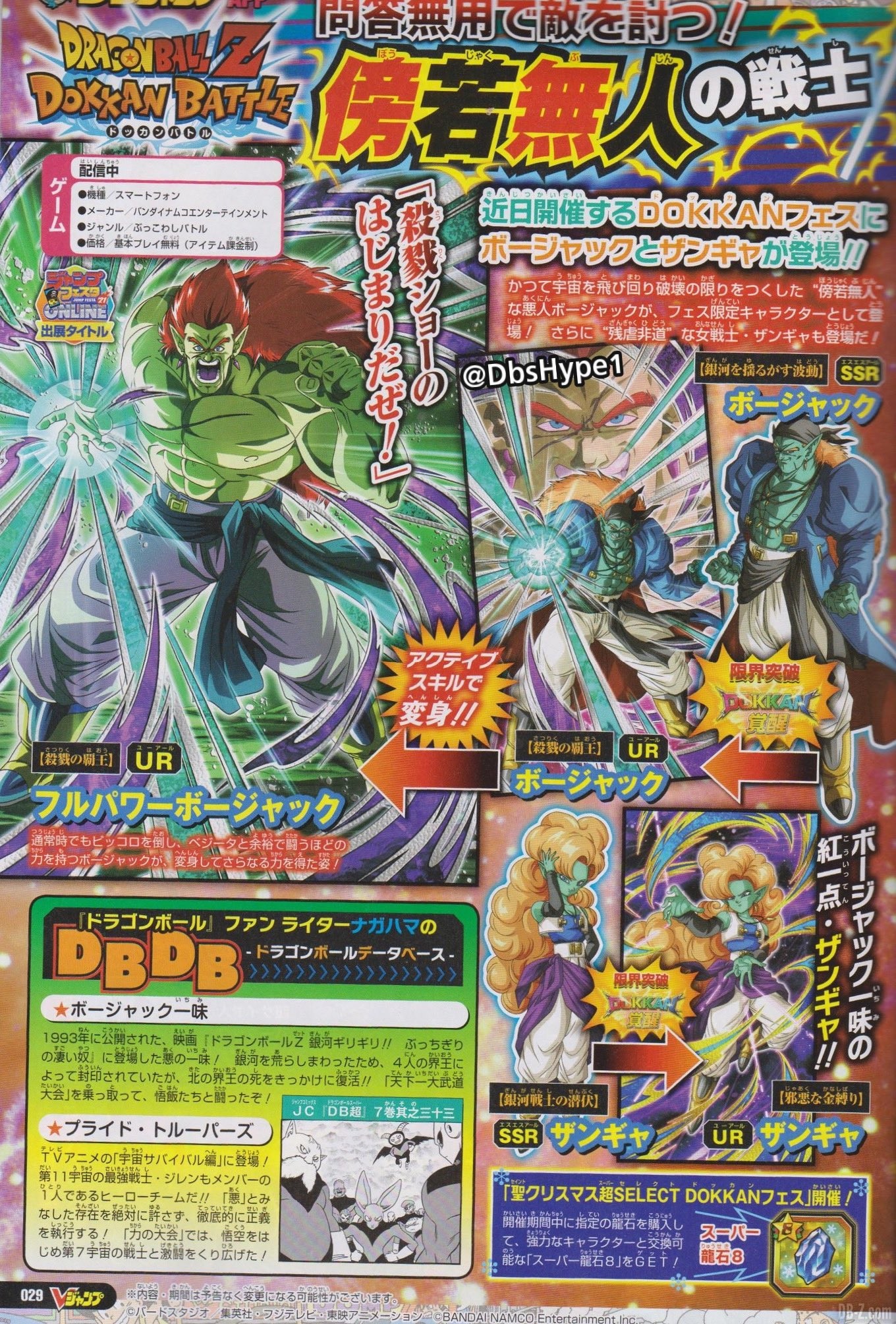 Côté tous les mois (en réalité comme toutes les deux semaines), de nouveaux personnages rejoignent les castings de Dokkan Battle et Dragon Ball Legends. Côté Dokkan, ce sont deux personnages qu’on retrouvera prochainement, à savoir Bojack (transformable), et Zangya (transformable).