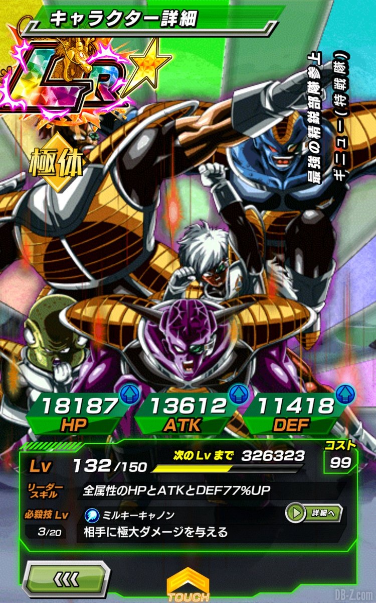 Attaque Spéciale 2 (entre 18 et 24 KI) : Inflige des dégâts titanesque, augmente l’ATK de 40% pour tous les alliés de type EXTRÊME durant 1 tour.