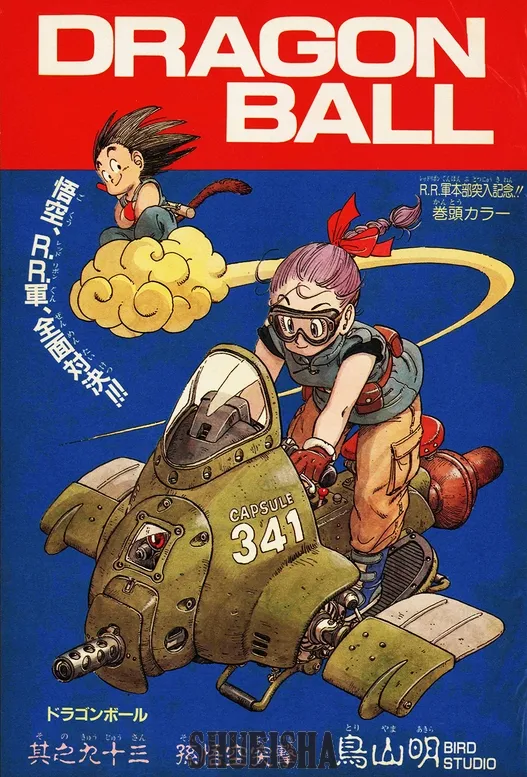 L’image parlera aux fans les plus fidèles. C’est la couverture du chapitre 93 intitulé « Le quartier général du Red Ribbon », celui où Goku fonce vers le QG de l’Armée du Red Ribbon. Pourtant, ce n’est pas Goku qui occupe le premier plan, mais Bulma, représentée sur le véhicule Mecha Capsule Corp. 341 au style militaire.