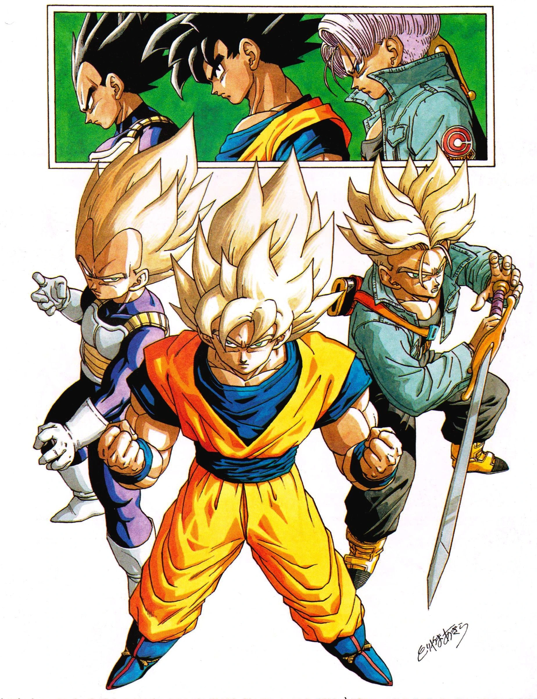 La pose des trois Super Saiyan côte à côte reproduit à la perfection une célèbre illustration du regretté Toriyama (image de droite). Le constructeur sait exactement comment inciter les collectionneurs à l’achat des 3 SHFiguarts pour les exposer en vitrine !